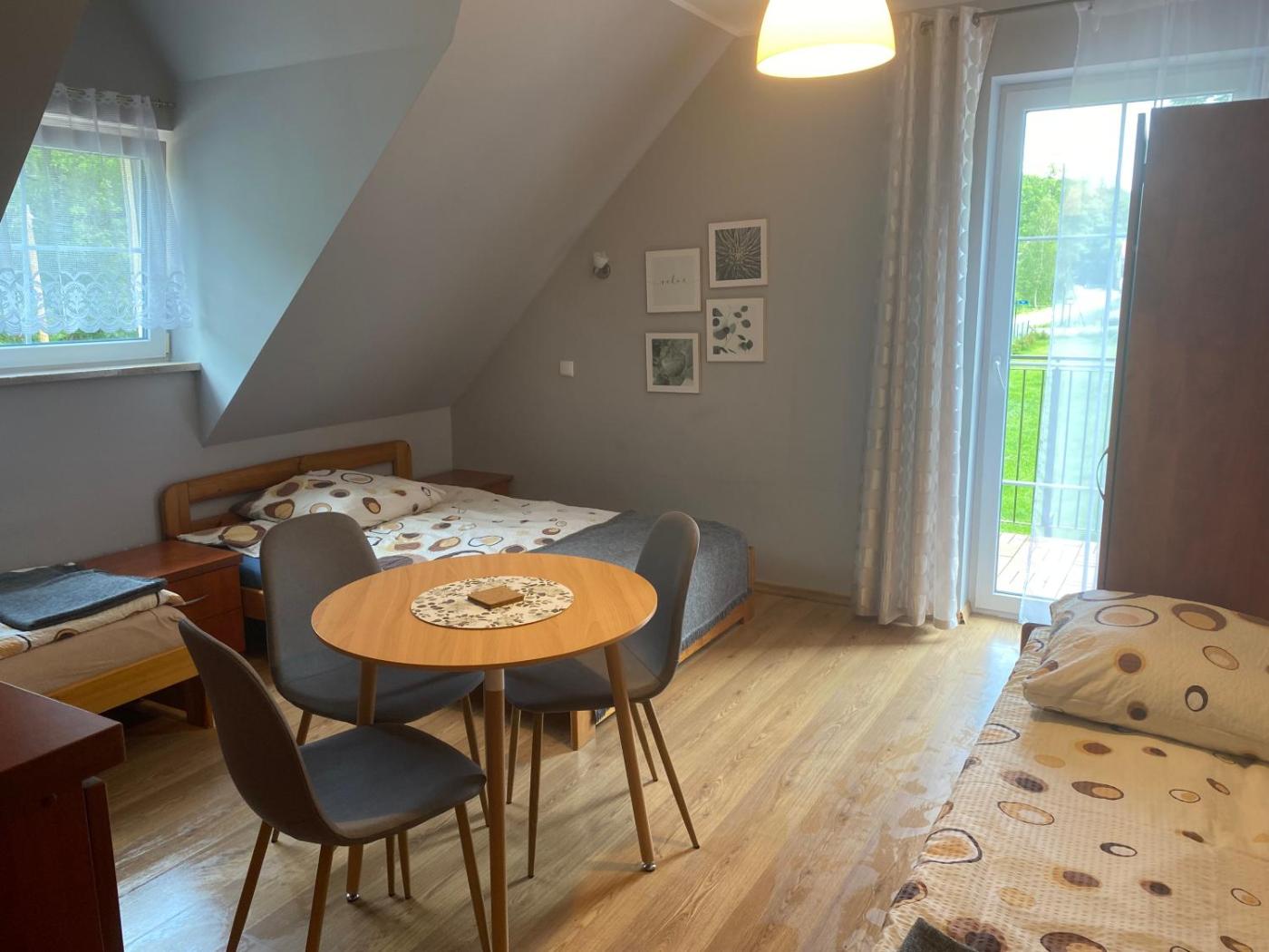 Pokój Czteroosobowy z balkonem. The quadruple room provides a private entrance, a dining area, a balcony with garden views as well as a private bathroom featuring a shower. The unit offers 3 beds. Pokój Czteroosobowy - 4 osobowy. Powierzchnia pokoju ok.: 17 mkw.