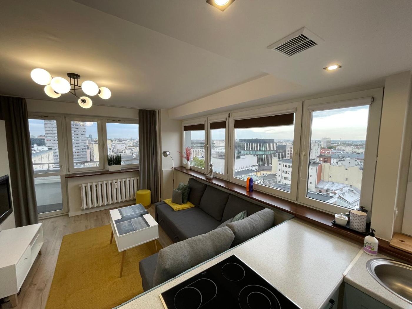 Studio z balkonem i widokiem na miasto (XII piętro) – ulica Chmielna 35. The apartment features 1 bedroom and 1 bathroom with a shower and free toiletries. Meals can be prepared in the kitchenette, which comes with a stovetop, a refrigerator, kitchenware and an oven. Featuring a balcony with city views, this apartment also provides a tea and coffee maker and a flat-screen TV with cable channels. The unit offers 2 beds. Apartament - 4 osobowy. Powierzchnia pokoju ok.: 27 mkw. ;